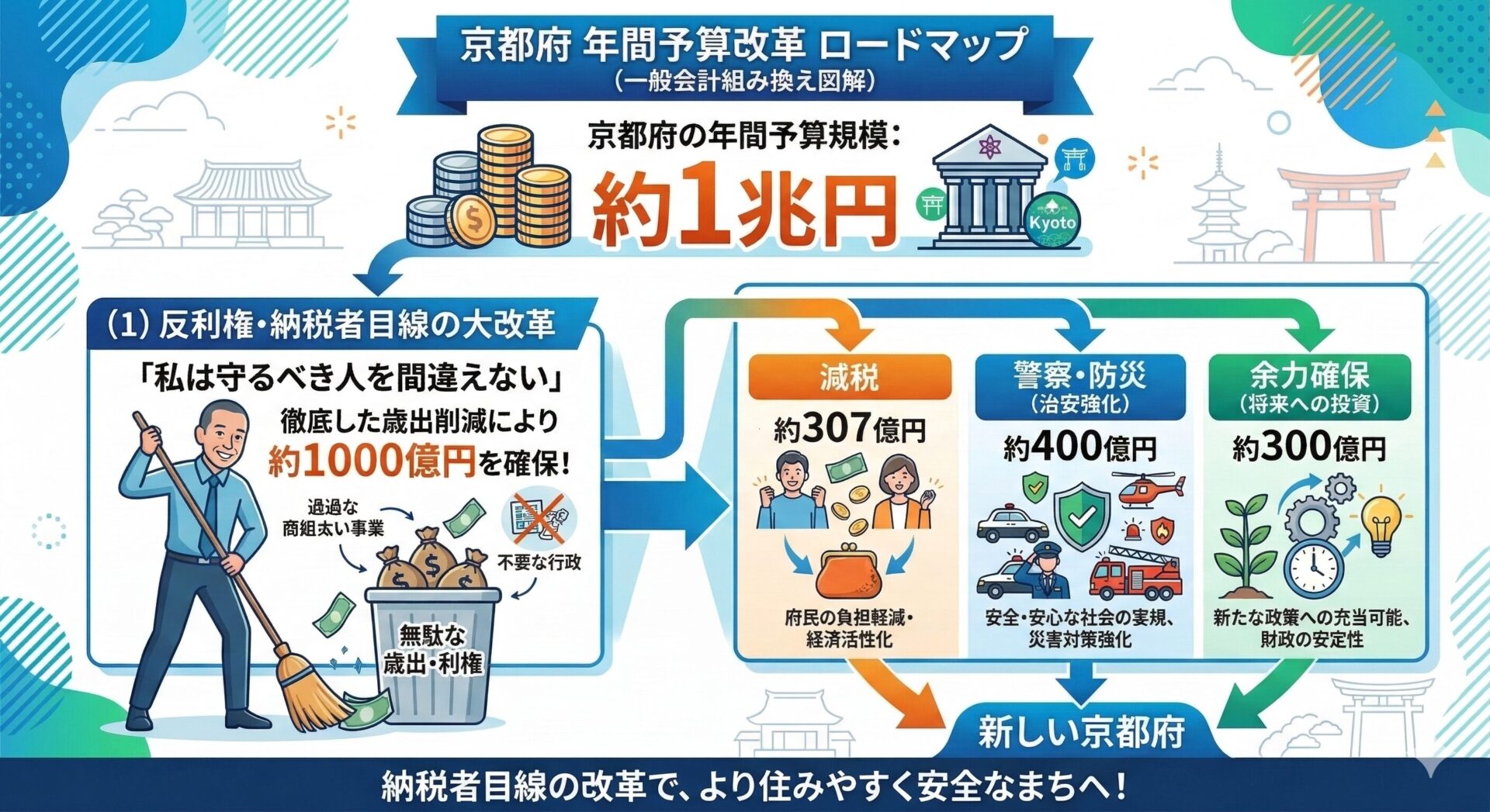 「マイナスシーリング」とは、予算の上限をあらかじめ前年より低く設定することです。京都府の年間予算は約1兆円ですが、浜田氏はこれを最低10%(1000億円)削減することを各部局に義務づけるとしています。この1000億円が、減税や治安強化の財源になります。ただし一律カットではなく、不要な事業を廃止した上での削減です。