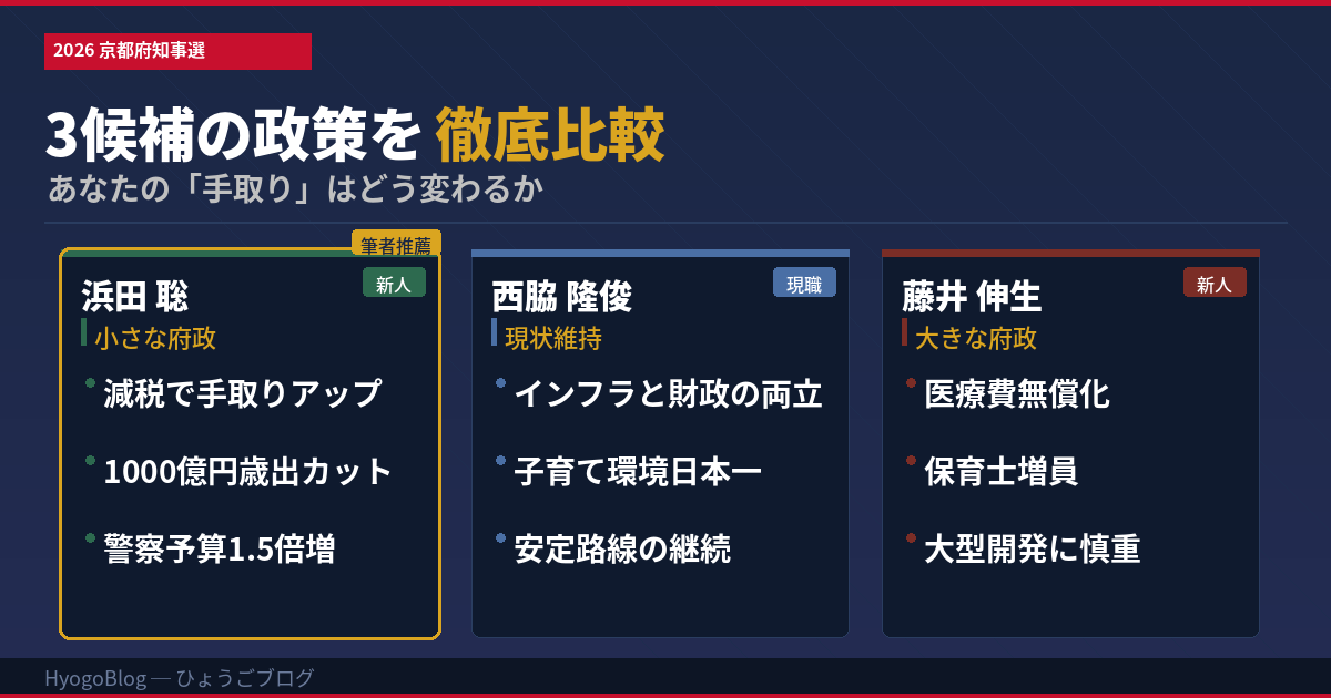 2026年京都府知事選には、前参議院議員・諸派新人の浜田聡氏、3選を目指す現職の西脇隆俊氏(自民、中道、国民、立民、公明推薦)、大学名誉教授・無所属新人の藤井伸生氏(共産推薦)、の3名が立候補しています。